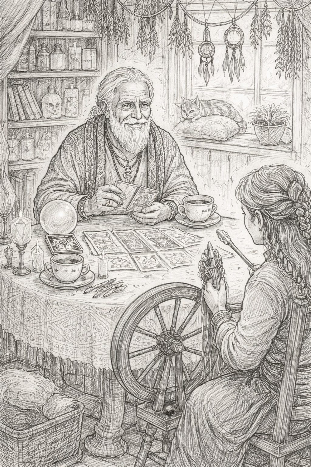 I drew a sketch of the cards, at his request. Then I stood to leave, but he touched my arm. “You are weary, come sit for tea.” As we walked into the kitchen, the kettle was already warm, but with no sound. A woman sit at the table weaving a tapestry. She did not speak. She only smiled at me as I greeted her. So I sat.