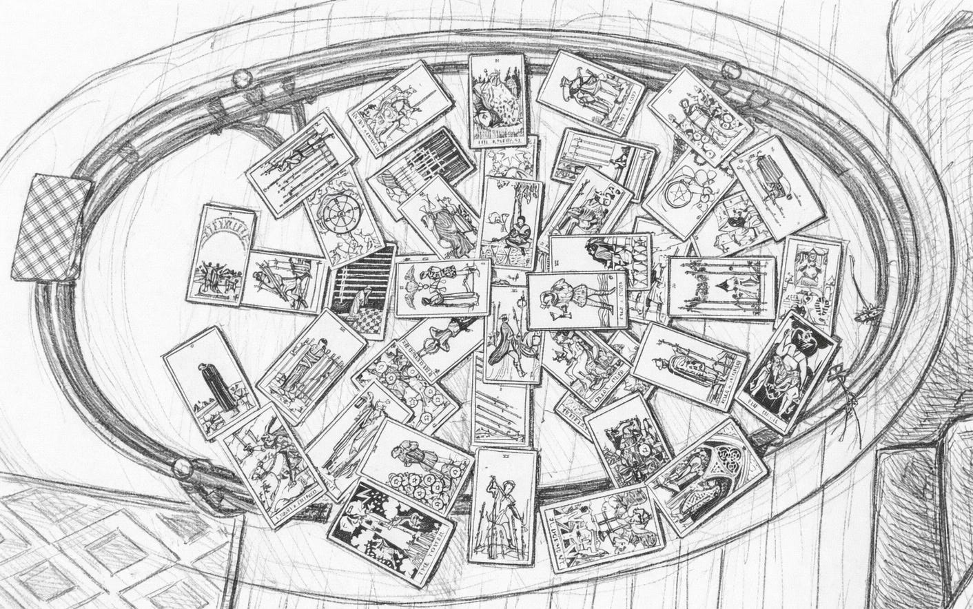 He sat, almost bored with me, as I lay the cards into piles. When I was finished, he scooped them up into his hands, putting the others back inside the box. He then began laying them out on the table, in a similar oblong order. He did not speak until all the cards had been played. When he looked up at me again, his eyes were wide, as if in a trance.